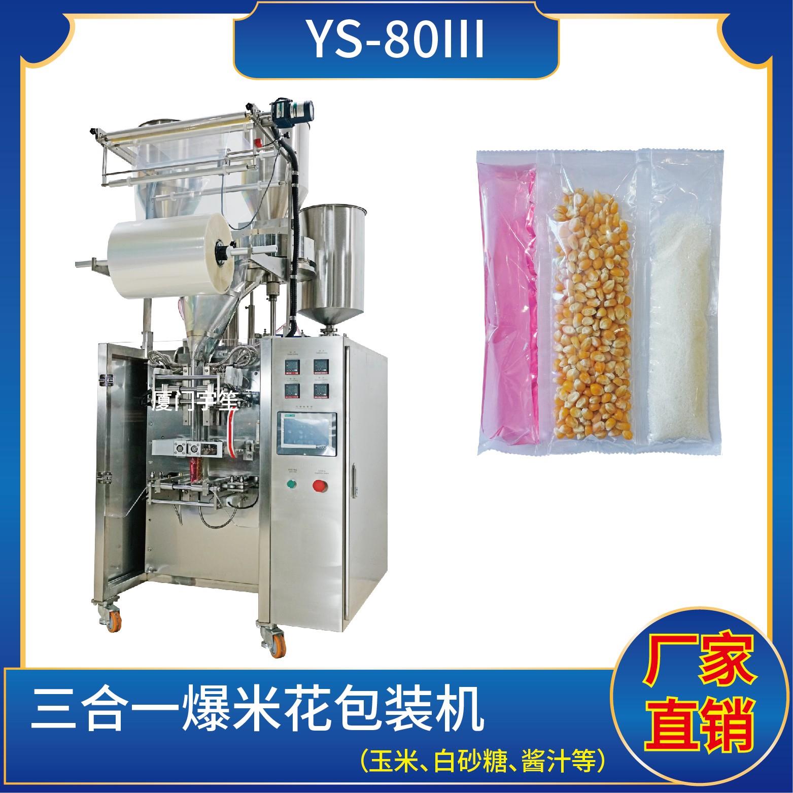 YS-80三列 三合一爆米花包裝機(使用鍍鋁、塑膠膜包裝)特點:1、適用于食品、醫(yī)藥、化工、化妝品行業(yè)中顆粒、粉劑、液體、醬料等物品的計量包裝。2、可自動完成制袋、計量、下料、封合、分切、計數(shù),可根據(jù)客戶要求配置打印批號等功能。3、觸摸屏操作,PLC控制,伺服電機控制袋長,性能穩(wěn)定、調整方便、檢測準確。智能式溫…